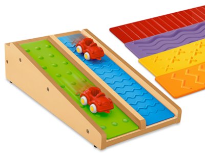 Kids explore motion, friction, cause and effect, and more—with a 2-lane activity ramp that brings STEM concepts to life! Children just place a textured path on each side of the divided wooden ramp…then compare how the different textures affect the speed and momentum of rolling objects. Great for use with toy vehicles, balls and more, the ramp includes 6 rugged plastic paths. Ramp measures 16" in length; each lane measures 3 1/2" wide. Cars sold separately.