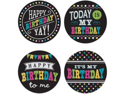These colorful birthday badge stickers are the perfect way to help kids feel special on their big day! Students will love wearing these chalkboard-style badges to proudly celebrate their birthdays—and parents will enjoy hearing about their child’s special day at school! Pack includes 32 self-adhesive badges in 4 designs; each badge measures 2 3/8" in diameter.