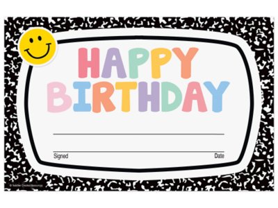 These vibrant and trendy composition book–themed birthday certificates will become keepsakes for every youngster who receives one! Each piece features space for personalized messages that students will cherish. Pack includes 30 paper certificates; each measures approximately 5 1/2" x 8 1/2".