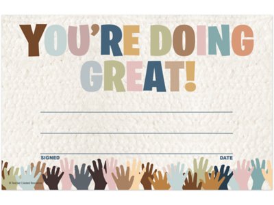 Printed on sturdy paper, these subtly colored awards with celebratory handprints will become keepsakes for every youngster who receives one! And the “You’re Doing Great!” message allows for personalization to build self-esteem. Pack includes 30 awards; each measures approximately 5 1/2" x 8 1/2".