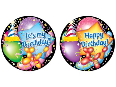 These festive birthday badge stickers are the perfect way to help kids feel special on their big day! Students will love wearing these bright badges to proudly celebrate their birthdays—and parents will enjoy hearing about their child’s special day at school! Pack includes 32 self-adhesive badges in 2 designs; each badge measures 2 3/8" in diameter.