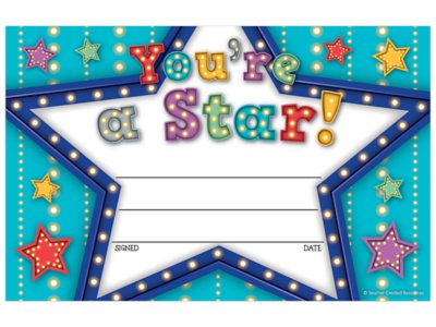Printed on sturdy paper, these marquee-themed awards will become keepsakes for every youngster who receives one! And the “You’re a Star!” message allows for personalization to build self-esteem. Pack includes 30 awards; each measures 5 1/2" x 8 1/2".