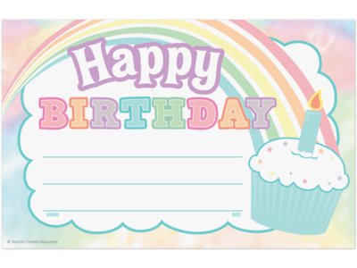 Printed on sturdy paper, these charming, pastel, rainbow- and cupcake-themed birthday certificates will become keepsakes for every youngster who receives one! Pack includes 30 certificates; each measures approximately 5 1/2" x 8 1/2".