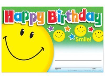 Printed on sturdy paper, these smiley face birthday certificates will become keepsakes for every youngster who receives one! Pack includes 30 certificates; each measures 5 1/2" x 8 1/2".