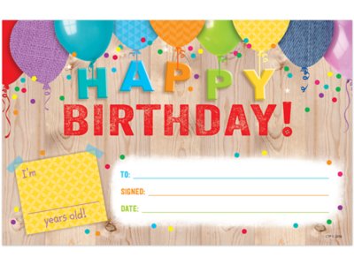 Say “happy birthday” in style with these bright and festive certificates! The certificates feature colorful balloons against a rustic wood background and are printed on durable cardstock—so students and their parents can enjoy them for years to come! Pack includes 30 certificates; each measures 5 1/2" x 8 1/2".