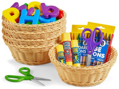 Keep supplies and manipulatives in durable baskets that have a soft, natural look! Made of securely woven plastic, our no-fray baskets are built for years of classroom use…and designed to look like real wicker. You get 5 dishwasher-safe plastic baskets. Baskets measure 8" in diameter and 3 1⁄4" tall.