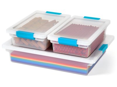 Our see-inside, multipurpose bins hold tons of supplies and save space—nesting when empty and stacking when lidded! The durable plastic bins even come with lids that attach with snap-tight latches.