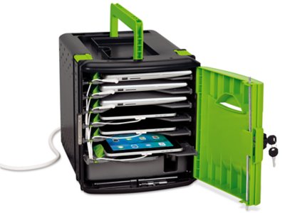 Store, charge and transport up to 6 devices at one time! Our heavy-duty plastic tub has adjustable shelves, a cable organizer to keep cords tidy…plus an internal 6-outlet power strip to charge tablets and laptops up to 9" x 12". The tub also features super-convenient carrying handles—making it a breeze to tote from class to class! Tub includes a lock with 2 keys and mounting hardware to secure the tub to a surface. Tub measures 11 1⁄2"w x 15 1⁄4"d x 13 1⁄4"h. Devices and charging cables not included.