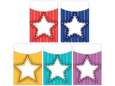 These handy and versatile pockets have a multitude of uses in the classroom and elsewhere! Put them on a bulletin board for an instant job chart…add them to a classroom center to manage student work…use them to hold craft sticks, game pieces and 3" x 5" index cards…and, of course, put them inside books in your classroom library, too! Pack includes 35 library pockets with a marquee-inspired design in 5 colors; each pocket measures 3 1/2" x 5".