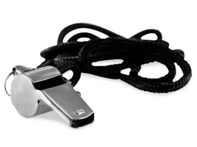 Make yourself heard with this lightweight whistle! The silver metal whistle produces a loud sound and hangs from a black, 21" lanyard that can be worn around the neck. Whistle measures 2".