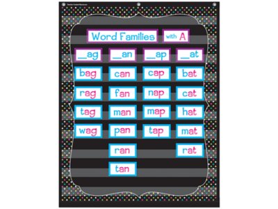 This handy polka dot and chalkboard-themed pocket chart lets you display task cards, flash cards, sentence strips and more—neatly and conveniently! The nylon chart features a nonporous, easy-to-clean surface, 10 rows of clear plastic pockets, plus metal grommets for easy hanging. Chart measures 34" x 44". Cards not included.