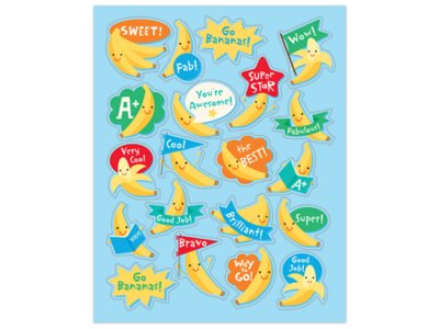 Silly banana characters make these motivational stickers a must-have in any classroom! The long-lasting smell adds a special touch to papers, tests, assignments, crafts and rewards. Pack includes 80 self-adhesive banana-scented stickers in assorted designs; each sticker measures approximately 1".
