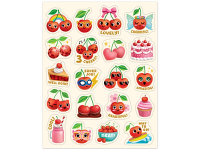Sweet and bold, these stickers are a perfect pop of fruity fun! Each cherry-themed sticker comes with a burst of fragrance that makes learning even more exciting. Perfect for grading papers, decorating assignments, celebrating achievements and more. Pack includes 6 sheets of stickers in 20 designs, for a total of 120 stickers; each measures approximately 1" to 1 1/4".