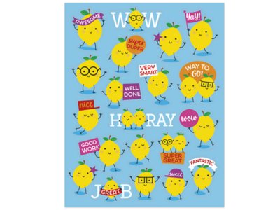 Silly lemon characters make these motivational stickers a must-have in any classroom! The long-lasting smell adds a special touch to papers, tests, assignments, crafts and rewards. Pack includes 80 self-adhesive lemon-scented stickers in assorted designs; each sticker measures approximately 1".