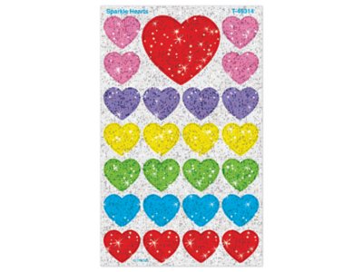 Sparkling heart stickers grab attention and spread love—and kids love to collect and trade them! Great on homework, invitations, notes and more, these stickers are nontoxic, acid-free and photo-safe. Pack includes 4 sheets of stickers in 6 colors and 2 sizes, for a total of 100 stickers; largest measures 11/16".