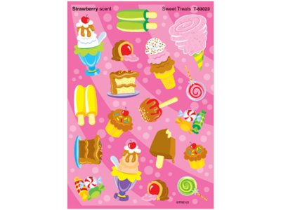Our strawberry-scented treat stickers are great for party favors, invitations, playtime and more! Scratch ’em and sniff ’em for a burst of fragrance that lasts for years of happy memories. Plus, the stickers are nontoxic, acid-free and safe to use on photos and in scrapbook albums. The scents do not contain nut oils. Pack includes 4 sheets of stickers in 16 designs, for a total of 72 stickers; most measure approximately 7/8".