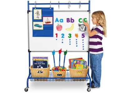 A child-sized chart stand & storage center in one! Our mobile stand is just the right height for kids—and it’s packed with features for hands-on learning. There’s a magnetic write & wipe board for daily activities, rings to hang charts & tablets, plus a bottom shelf for tools & supplies! With 4 locking casters. Easy assembly. Baskets & supplies not included.