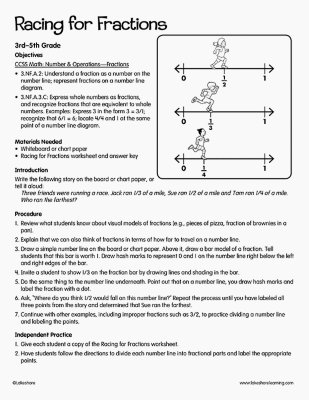 Objectives CCSS Math: Number & Operations—Fractions 3.NF.A.2: Understand a fraction as a number on the number line; represent fractions on a number line diagram. 3.NF.A.3.C: Express whole numbers as fractions, and recognize fractions that are equivalent to whole numbers. Examples: Express 3 in the form 3 = 3/1; recognize that 6/1 = 6; locate 4/4 and 1 at the same point of a number line diagram. Materials Needed Whiteboard or chart paper Racing for Fractions worksheet and answer key Introduction Write the following story on the board or chart paper, or tell it aloud: Three friends were running a race. Jack ran 1/3 of a mile, Sue ran 1/2 of a mile and Tam ran 1/4 of a mile. Who ran the farthest?