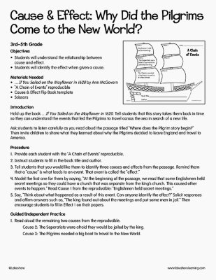 Objectives Students will understand the relationship between cause and effect. Students will identify the effect when given a cause. Materials Needed …If You Sailed on the Mayflower in 1620 by Ann McGovern “A Chain of Events” reproducible Cause & Effect Flip Book template Scissors Introduction Hold up the book …If You Sailed on the Mayflower in 1620. Tell students that this story takes them back in time so they can understand the events that led the Pilgrims to travel across the sea in search of a new life. Ask students to listen carefully as you read aloud the passage titled “Where does the Pilgrim story begin?” Then invite children to share what they learned about why the Pilgrims decided to leave England and travel to America.