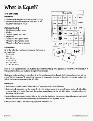 Objectives Students will recognize and define the equal sign. Students will demonstrate that both sides of an equation are equal in value. Materials Needed Whiteboard or chart paper Marker “What Is Equal?” work mat Dry beans “Three In a Row” game board “Three In a Row” playing cards “Three In a Row” game markers Introduction Write the following number sentences on the board or on chart paper: 7 + 6 = 13 13 = 13 12 = 2 + 10 5 + 5 = 7 + 3 10 - 2 = 4 + 4 2 + 1 + 3 = 2 + 4 Point to each expression and ask students to put their thumbs up if the equation is true or their thumbs down if the equation is false. Ask students to explain their choices. Students may be surprised to learn that all of the equations are true. Explain that the equal sign does not just mean “this is the answer.” It means that one side of the equation is equal to the other—the value on the right side is the same as the value on the left side.