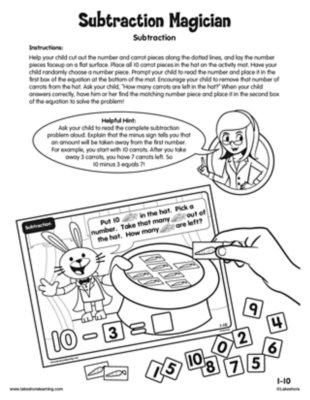 View worksheetDuring kindergarten, your child will learn to add and subtract simple facts. For example, 3 + 7 = 10 and 10 — 5 = 5.